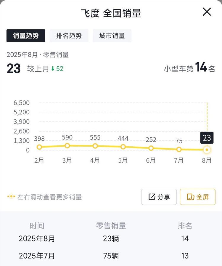 飞度的市场表现可谓一落千丈。数据显示,2024年飞度全年销量仅为14742辆,同比暴跌74%。而更令人触目惊心的是,今年8月单月销量只有23台。